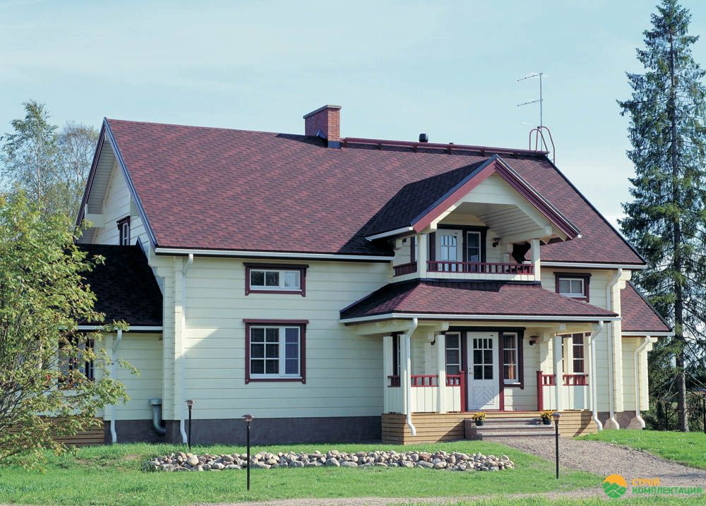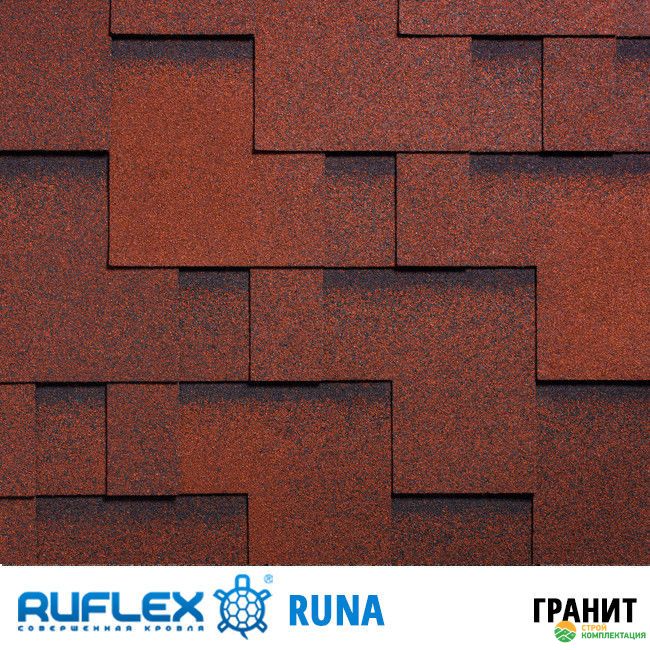 Черепица цвета Гранит из яркой, неординарной коллекции Runa обладает исключительными эстетическими и эксплуатационными качествами. Сочетание красного и чёрного цвета с обилием теней придаёт кровле сходство с природным камнем. Гибкий гонт с многочисленными прямыми углами создаёт имитацию настоящих деревянных дощечек разной формы, уложенных на крыше в средневековом стиле.
