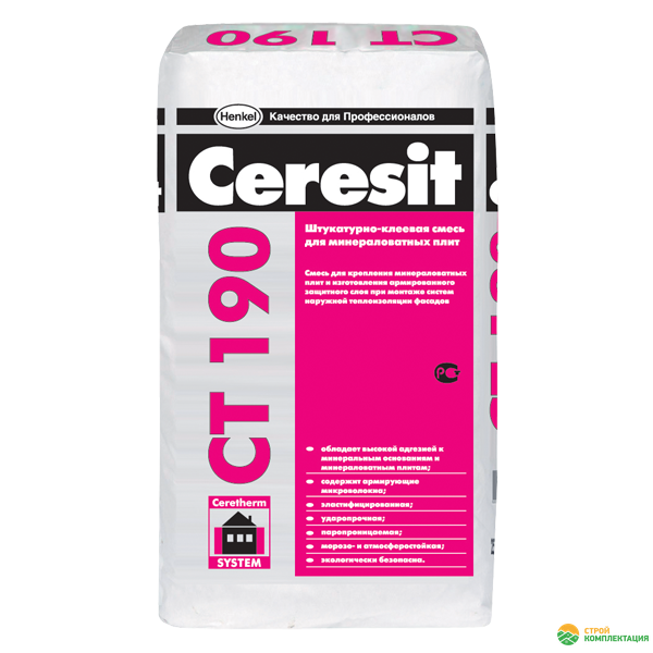Штукатурно-клеевая смесь Ceresit CT 190 для крепления минераловатных плит и создания базового штукатурного слоя при наружной теплоизоляции фасадов